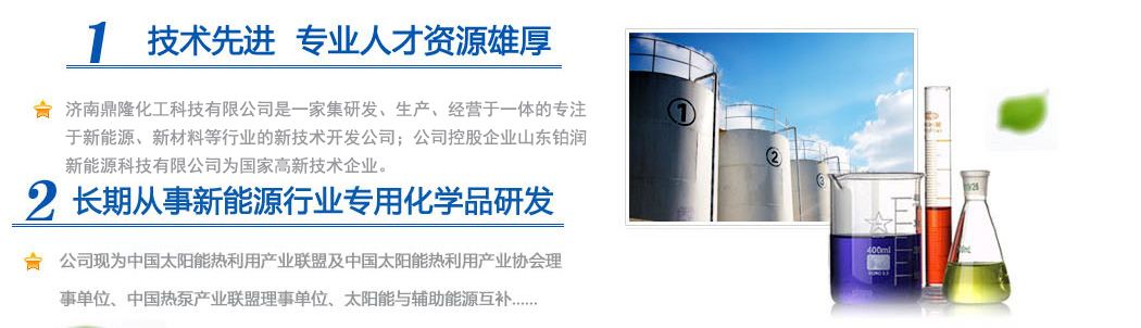 濟南鼎隆化工科技有限公司是一家集研發(fā)、生產、經營于一體的專注于新能源、新材料等行業(yè)的新技術開發(fā)公司;公司控股企業(yè)山東鉑潤新能源科技有限公司為國家高新技術企業(yè)。擁有雄厚的科研實力和專業(yè)銷售隊伍以及多名從事化學化工專業(yè)的高素質人員,其中博士生導師1人,碩士研究生3人。公司現為中國太陽能熱利用產業(yè)聯盟及中國太陽能熱利用產業(yè)協會理事單位、中國熱泵產業(yè)聯盟理事單位、山東清潔能源供暖產業(yè)聯盟理事單位、太陽能與輔助能源互補供熱/制冷工程專業(yè)委員會會員單位。公司專注于綠色科技,專業(yè)化研發(fā)環(huán)境友好型化工產品,與眾多高校和國內外多家著名化學品公司保持戰(zhàn)略合作關系。公司擁有“載能”和“澤能”...更多